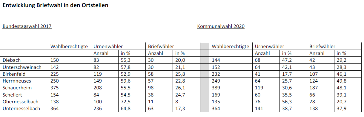 Seit der Bundestagswahl im Jahr 2017 hat der Anteil der Briefwähler stark zugenommen. Dies und die Corona Pandemie hat dazu geführt, dass bei der Kommunalwahl 2020 in sechs der acht Ortssteilen die erforderliche Anzahl von 50 Urnenwählern nur knapp erreicht wurde. Lediglich in den Ortsteilen Unternesselbach und Schauerheim wurde die erforderliche Mindestanzahl der Urnenwähler deutlich überschritten. Bei einem Unterschreiten der Anzahl von 50 Urnenwählern in einem Wahllokal ist die Auszählung der Wahl zur Wahrung der Anonymität dann nur zusammen mit einem anderen Wahllokal zulässig.